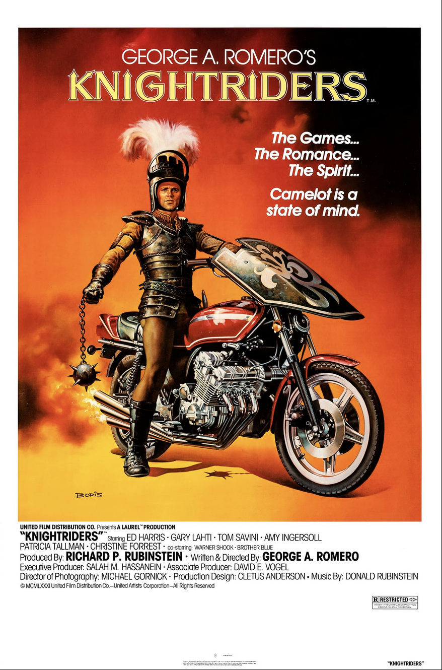 Knightriders is Romero’s love letter to his craft, highlighting through modern Arthurian legend the commitment and potential alienation of independent filmmaking. The more contemplative soundtrack thus leans on acoustic guitar and other folk instrumentation.