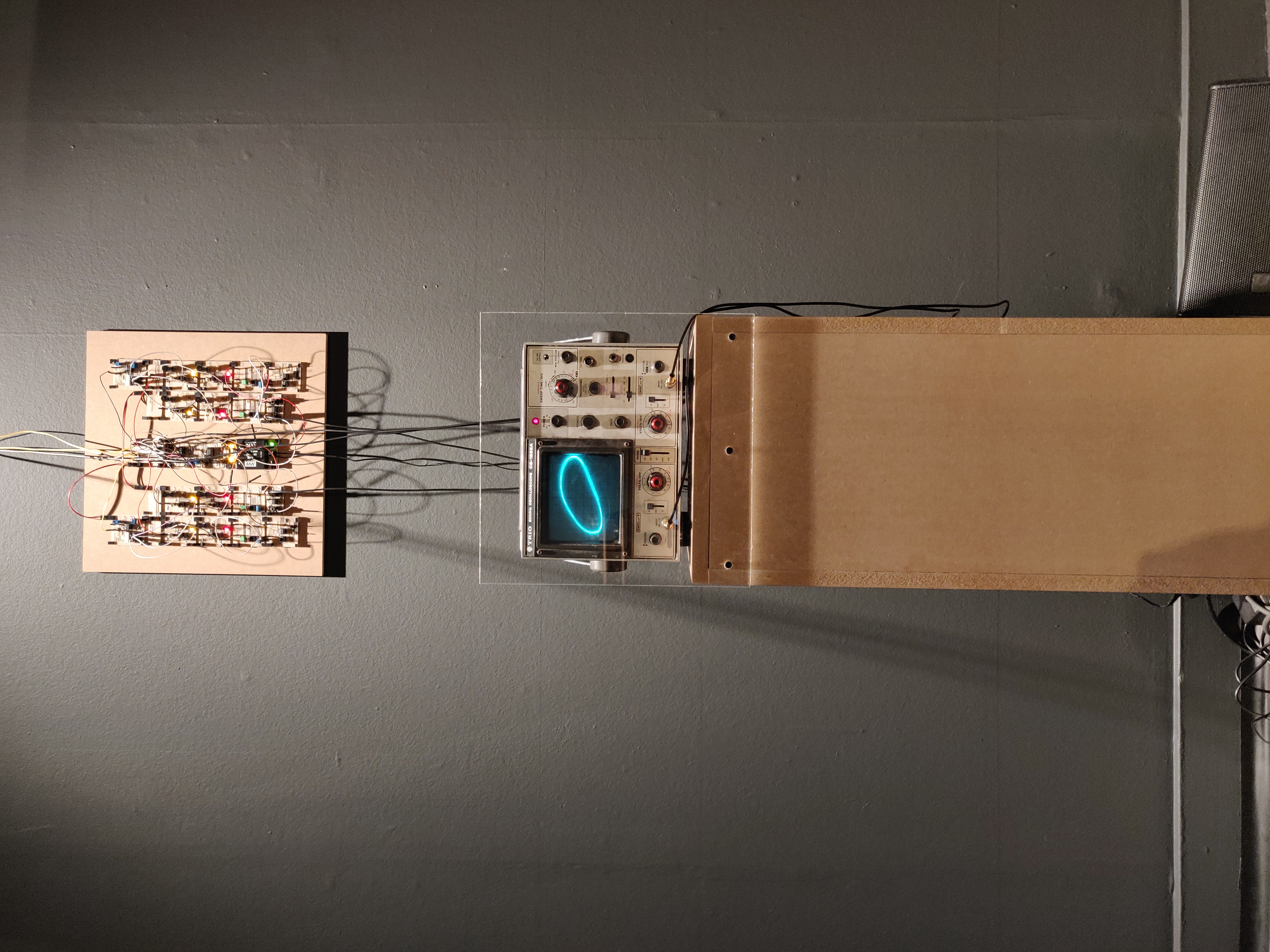 A kinetic light and sound installation that runs on a network of 100 artificial analogue neurons.