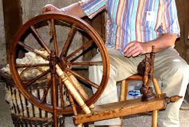 A spinning wheel is a large mechanical machine that twists cotton or wool fibers into yarn.