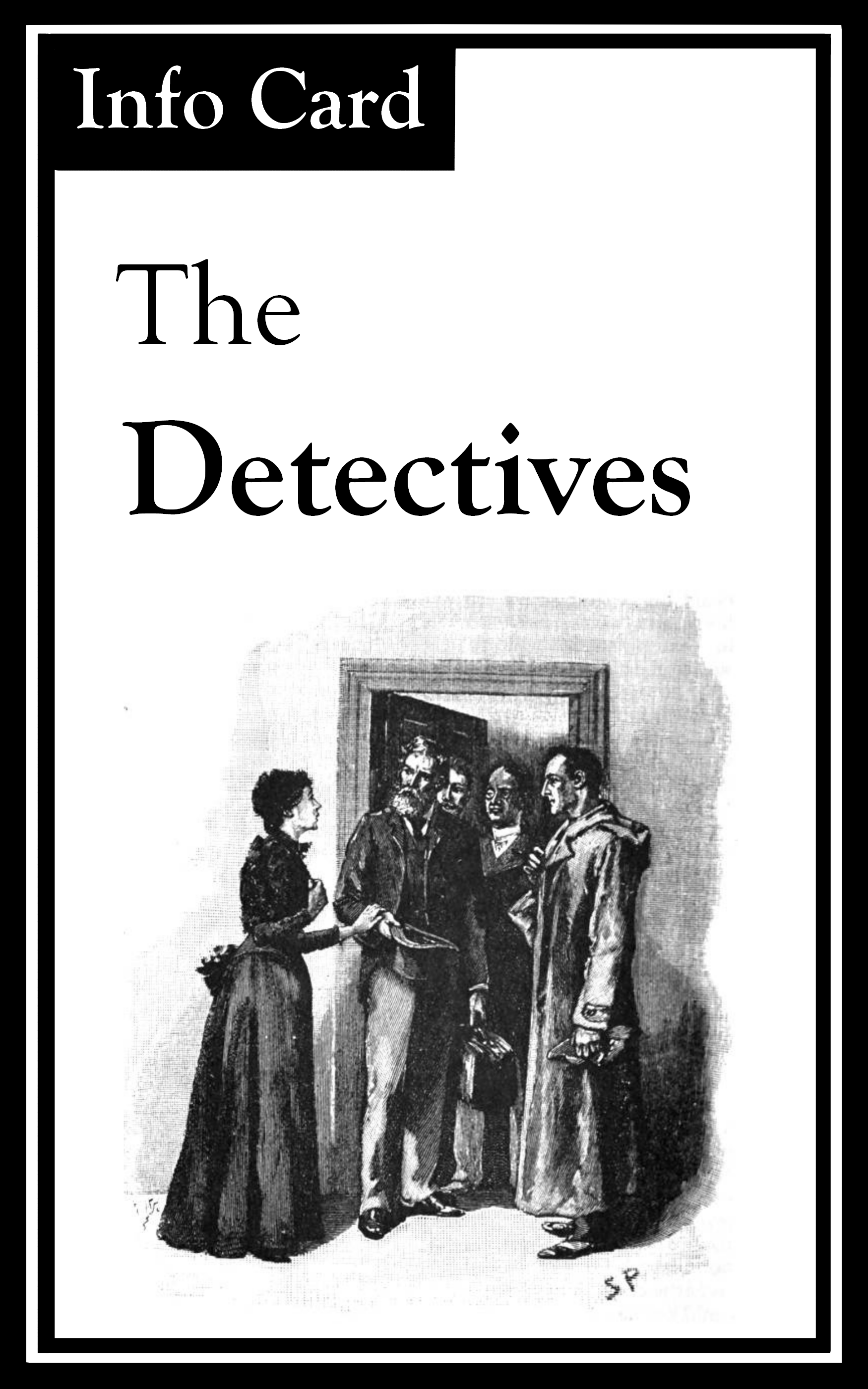 This is the Information Card for the various detectives working on the case. The physical card has an image of Holmes, Watson, and various other men presumably associated with Scotland Yard. The audio for this card explains the involvement of Holmes and Watson as well as the contributions of Scotland Yard.