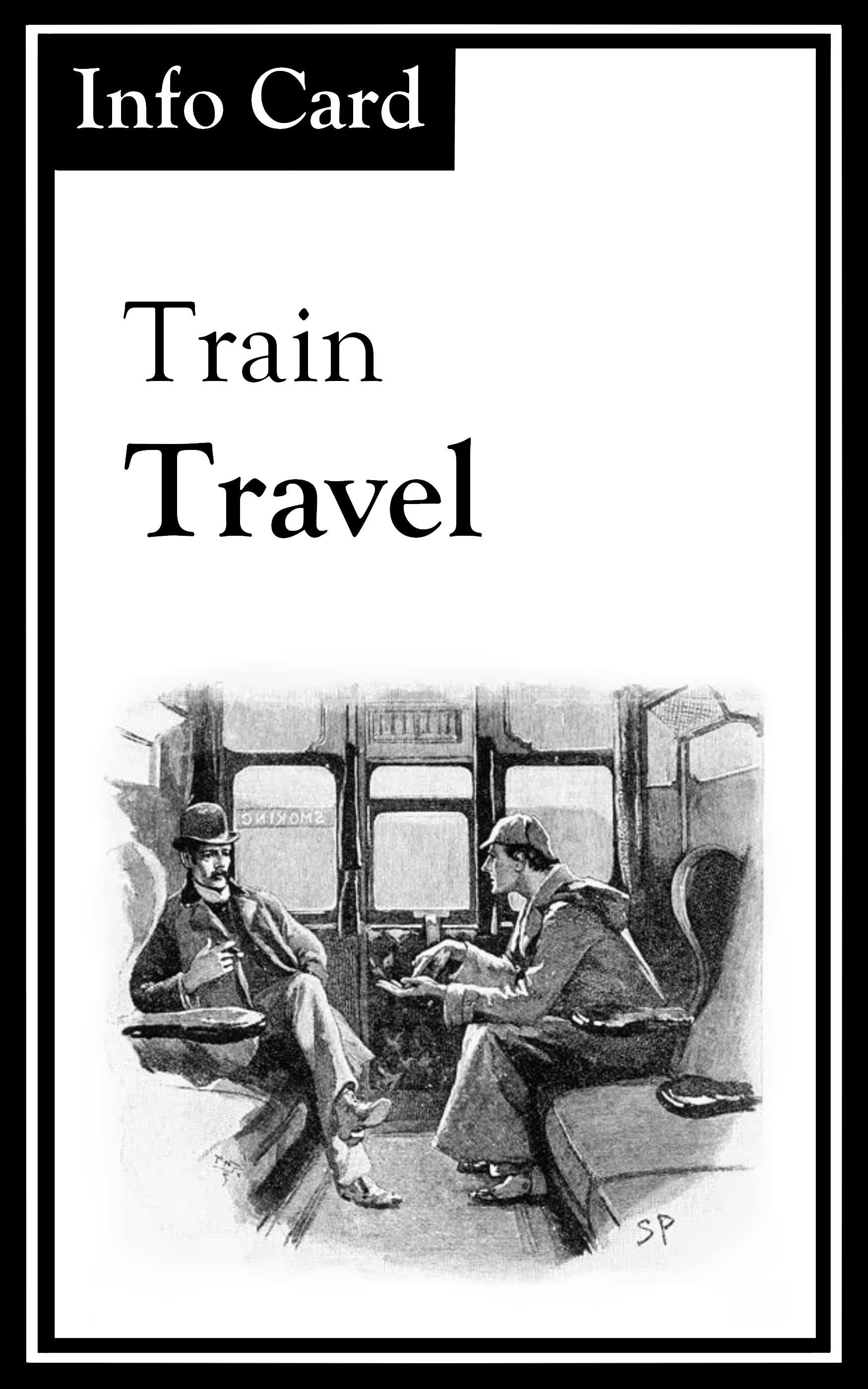 This is the Information Card for train travel. The physical hard has an image of locomotive steam train. The audio for this card details the various location Holmes and Watson travel to and the significance of train travel in relation to the plot.