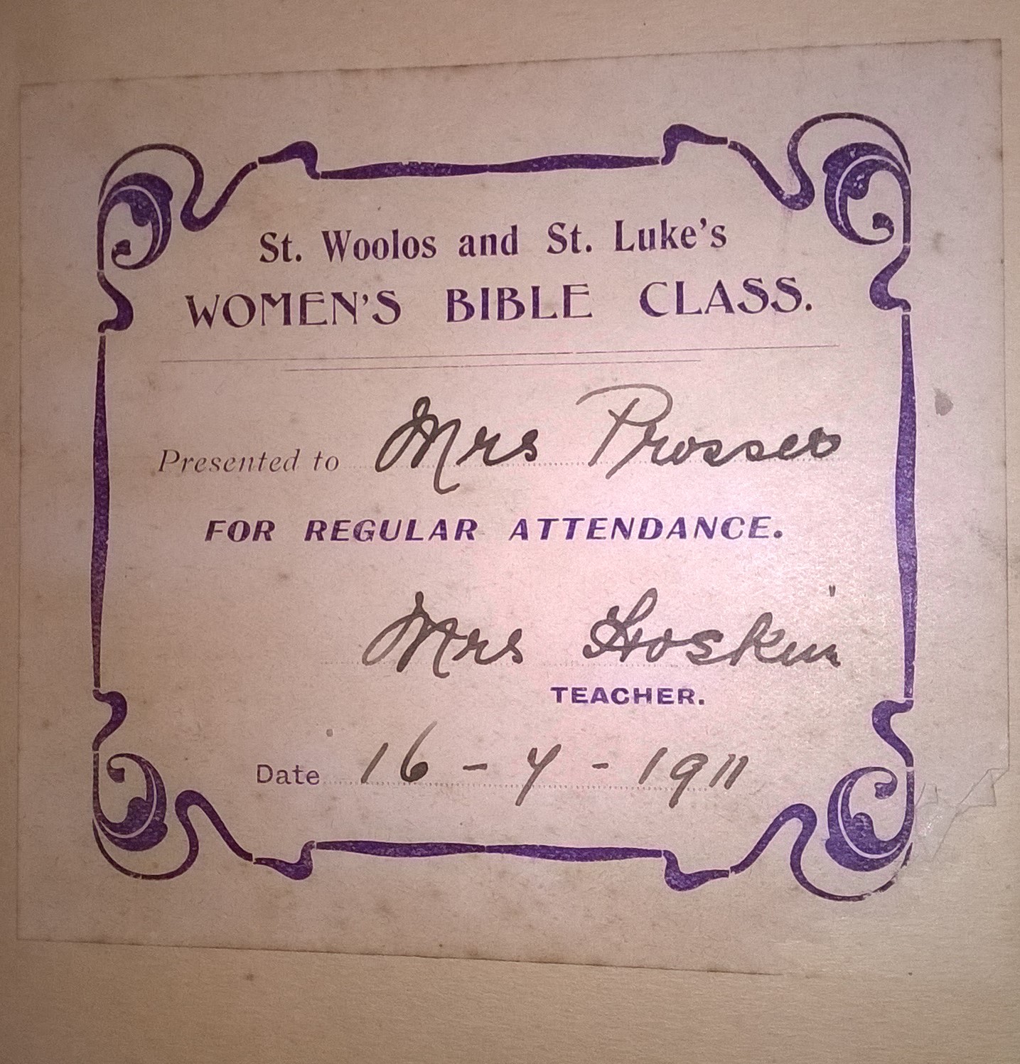 Bible Class prize sticker, awarded to Mrs Prosser by St Woolos and St Luke's Bible Class, Newport, c. 1911.