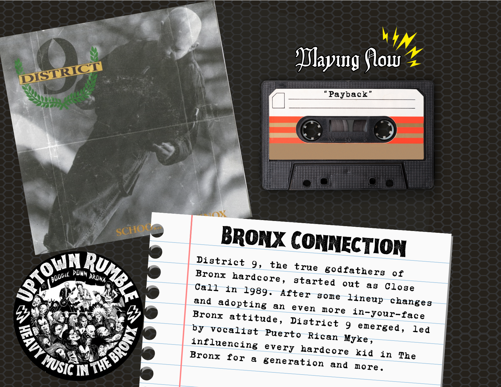 "Payback," mp3 recording of a track off Schoolahardknox EP (1995) by District 9