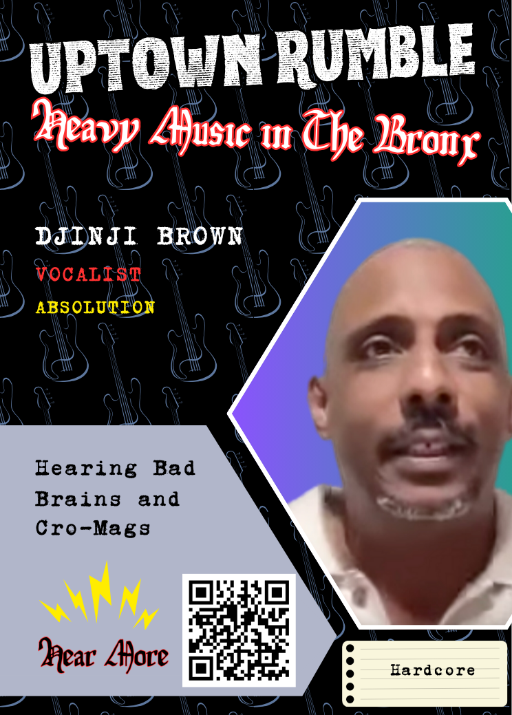 Clip in mp3 format on Hearing Bad Brains and Cro-Mags for the first time from a full-length oral history recorded with Djinji Brown (Absolution) for Uptown Rumble: Heavy Music in The Bronx