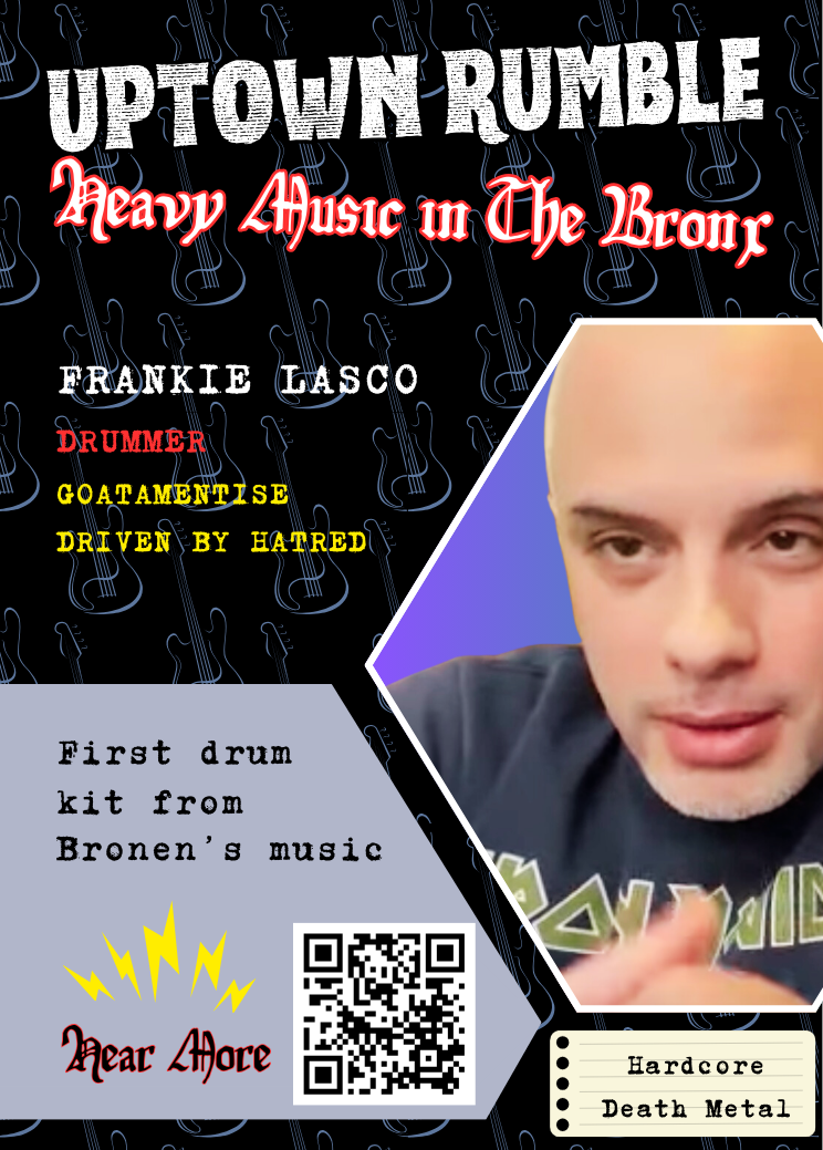 Clip in mp3 format on First drum kit from Bronen's Music from a full-length oral history recorded with Frankie Lasco (Driven By Hatred/Goatamentise) for Uptown Rumble: Heavy Music in The Bronx