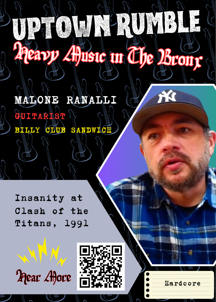 Clip in mp3 format on Insanity at Clash of the Titans show in 1991 from a full-length oral history recorded with Malone Ranalli (Billy Club Sandwich) for Uptown Rumble: Heavy Music in The Bronx