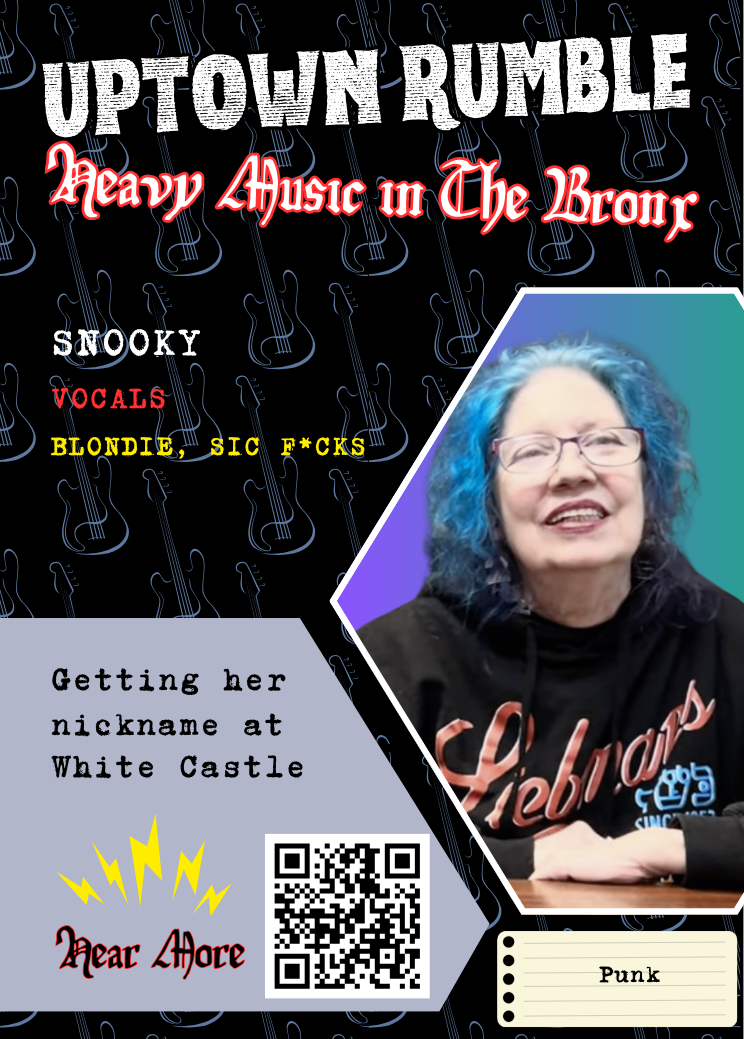 Clip in mp3 format on Getting her nickname at White Castle on Fordham Road from a full-length oral history recorded with Snooky (Blondie/Sic F*cks) for Uptown Rumble: Heavy Music in The Bronx