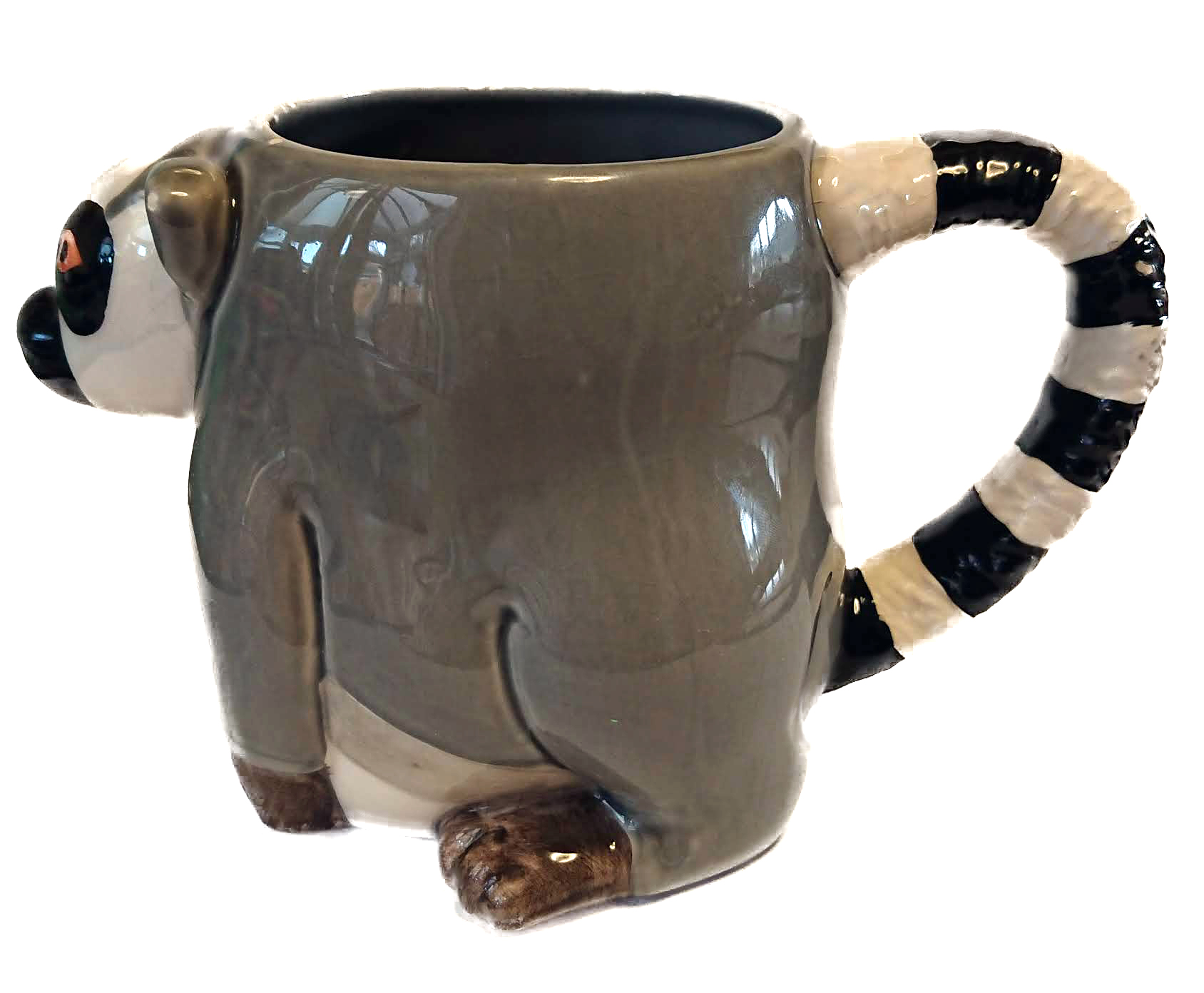 A mug shaped like a lemur belonging to Louise Robson. It was purchased from Flamingo Land Theme Park and Zoo in 2010. Louise had owned a similar mug a few years previous, but it fell of a shelf and smashed into smithereens – so when she saw this one, she had to buy it.