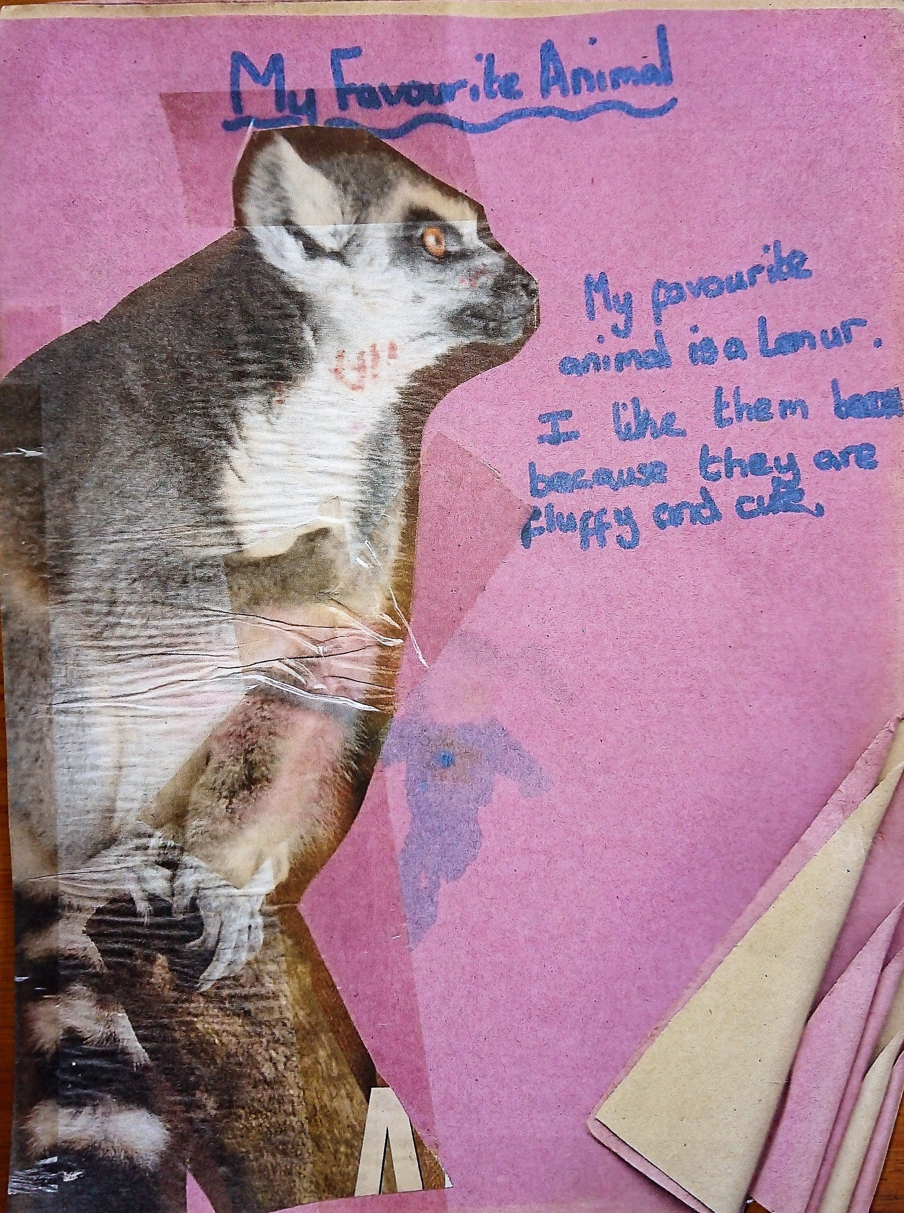 A page from a book called ‘My Favourite Things’ made by Louise Robson when she was 9 years old. The page reads “My favourite animal is a lemur. I like them because they are fluffy and cute.”. There is a picture of a lemur which Louise found in a newspaper taped onto the page.